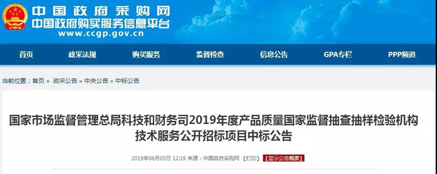 日前,中國政府采購網(wǎng)發(fā)布了國家市場監(jiān)督管理總局科技和財務司2019年度產(chǎn)品質(zhì)量國家監(jiān)督抽查抽樣檢驗機構(gòu)技術(shù)服務公開招標項目中標公告。