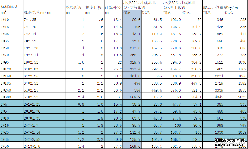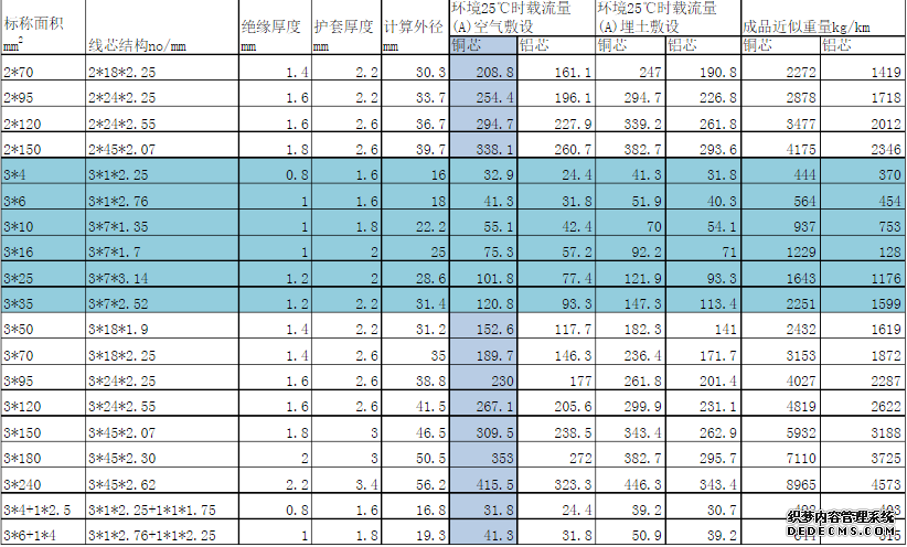 1.增大線芯面積提高電纜載流量。線芯面積(導(dǎo)線截面積)與載流量呈正相關(guān),通常安全載流量銅線為5~8A/mm2,鋁線為3~5A/mm2。