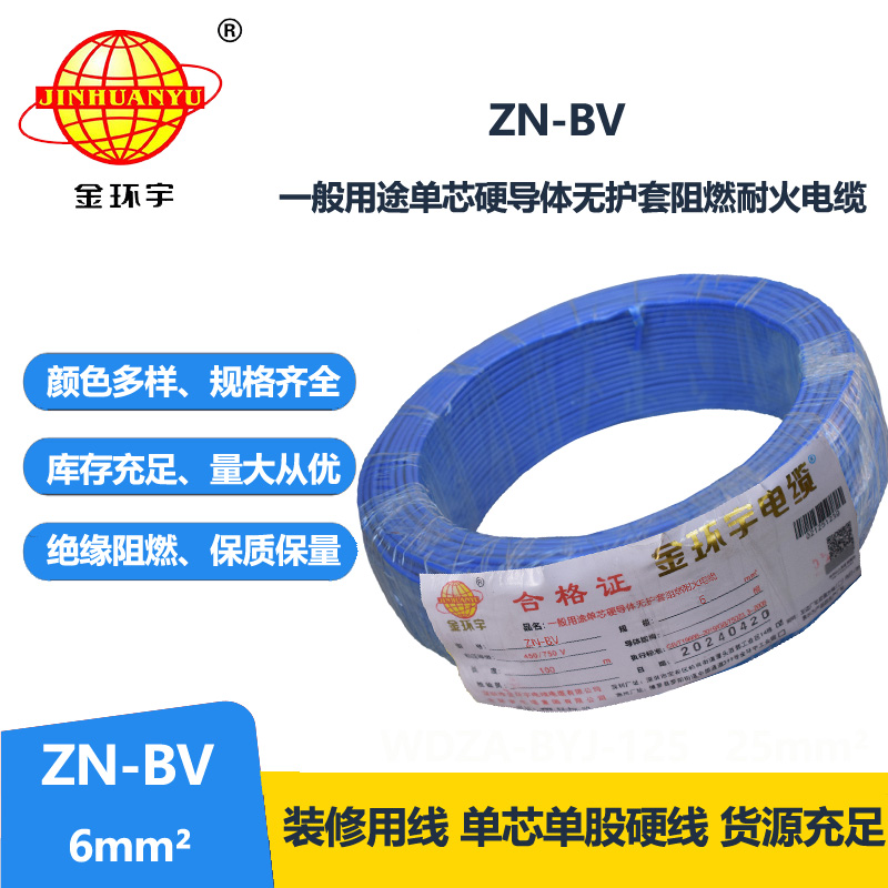 ZN-BV6平方就是導(dǎo)線截面為6平方毫米的銅芯聚氯乙烯絕緣阻燃電線,由一根銅線組成,多用于450/750V及以下動(dòng)力裝置、日用電器、儀表用線及固定的埋設(shè)當(dāng)中。