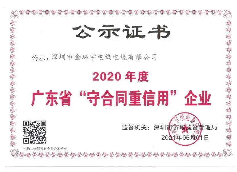 企業(yè)誠信守約經(jīng)營是推動社會經(jīng)濟健康發(fā)展的保證。2021年,深圳市質(zhì)量強市促進會繼續(xù)認真開展“廣東省守合同重信用企業(yè)”公示活動的宣傳、發(fā)動、核查和推薦工作,免費指導推薦會員企業(yè)參加了“廣東省守合同重信用企業(yè)”公示活動,經(jīng)深圳市市場監(jiān)督管理局審查、廣東省市場監(jiān)督管理局審定,288家會員企業(yè)榮獲2020年度“廣東省守合同重信用企業(yè)”稱號。金環(huán)宇躋身其一。
