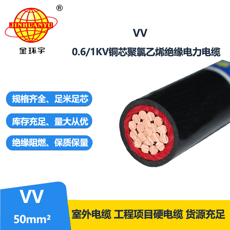 VV電纜是銅芯聚氯乙烯絕緣聚氯乙烯護套電力電纜,兩個字母V代表了絕緣和護套的材料都是聚氯乙烯。1*50平方是指電纜的銅芯為50平方毫米。